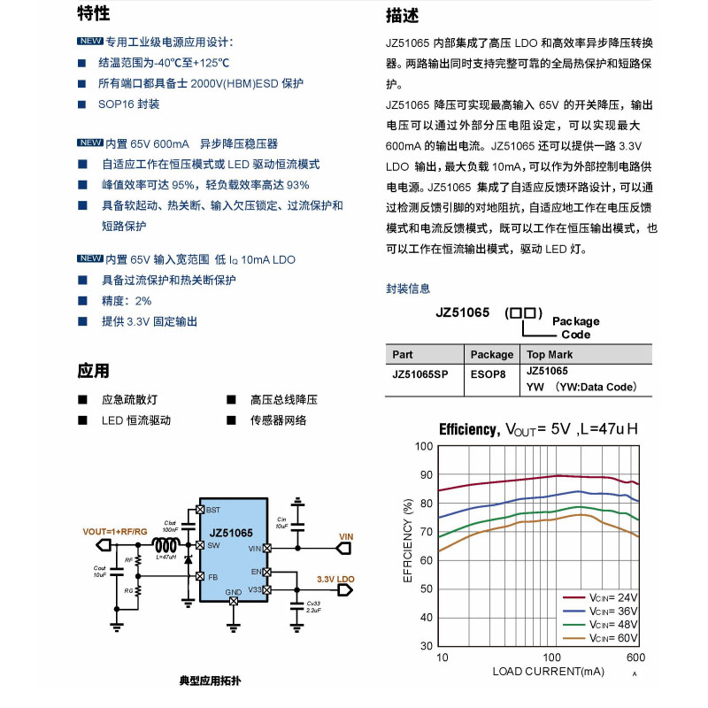 产品特性:输出电流:600mA;输入电压65V;集成高压LDO