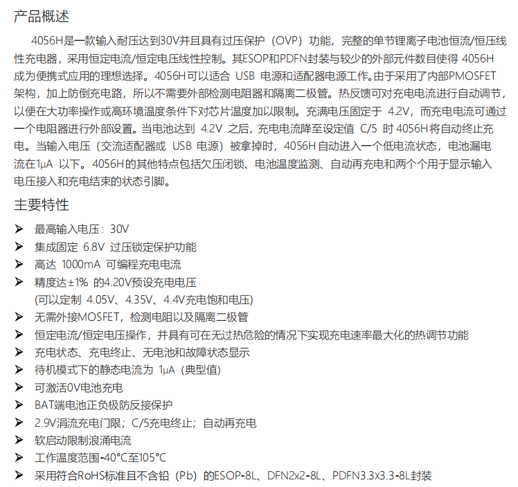 产品特性:输入耐压:30V;充电电流:1A;过压保护(OVP)功能
